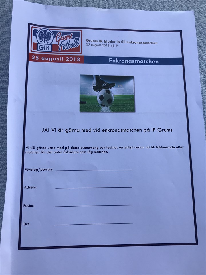 ENKRONASMATCH: Den 25/8 spelar A-laget en enkronasmatch uppe på IP mot Råtorp. Samtliga spelare i klubben får med sig en lapp angående detta. Vi började dela ut dem igår på träningen. (se bifogad bild.) Tanken är att man som företagare eller privatperson kan skänka en viss summa pengar per besökare på matchen. Ex. Jag väljer att skänka 1 kr per besökare. Det kommer 30 st vilket ger klubben 30 kr. 30% av summan som sponsorn eller privatpersonen tecknar går till vår lagkassa. Så här kan vi tjäna lite pengar. Lämna lappen till något företag och kolla om de vill sponsra eller sponsra gärna själv👍 Lämna sponsorlapparna när de är klara till mig eller Janne. Och glöm inte gå på matchen den 25/8. Ju fler vi blir desto mer pengar🙌 Vi kommer inte spela i halvlek som det var sagt från början. NEWBODY: Någongång mellan den 6-13 Augusti kommer vi börja sälja newbody. Det säljs för klubben så det vi tjänar kommer gå till Grums fotboll Det kommer delas ut på en träning. Mer info kommer. Team-2009 2 aug 2018 0kommentarer
