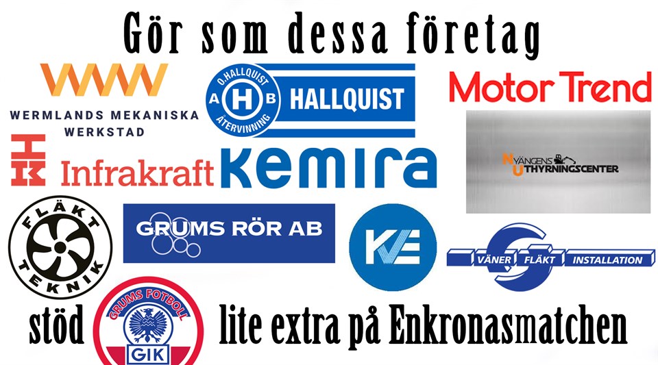 Till helgen så är det dags för säsongens enkronasmatch på Idrottsparken, på lördag klockan 14 tar vi emot KB Karlskoga till en mycket viktig match. Vi vill att alla Grumsbor tar sig till Idrottsparken för att stötta laget till 3 poäng samtidig hjälpa klubben ekonomiskt. Vill ni vara med att sponsra vår enkronasmatch så finns det blanketter att fylla i hur mycket man vill sponsra med, antingen ett fast belopp eller X kronor per åskådare som kommer på matchen. På bilden ser ni de sponoser som skänker lite extra till klubbens verksamhet. På vår Facebooksida kommer vi redovisa samtliga som skänkt pengar. (Om man vill synas) Blanketter för att vara med på enkronasmatchen finns nedan: Ifyllningsbar PDF Ladda ner och fyll i och maila den till grumsfotboll@telia.com Stort tack på förhand till alla våra supportrar, Vi ses på lördag.