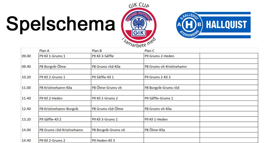 Våren går snabbt och snart är det dags för vår populära sommarcup, GIK Cup i samarbete med Hallquist Återvinning. GIK CUP är en cup för våra yngsta fotbollsspelare som äger rum den 1 juli i Grums. Åldersklasserna är P8 och P9, 5 mot 5, pojkar födda 2015 och 2014. Samtliga matcher spelas på naturgräs vid Grönbergs fina fotbollsanläggning i Grums, samtliga lag garanteras minst 4 matcher. Ingen slutsegrare koras, Svenska Fotbollsförbundetsbestämmelser gäller. Cupen är sanktionerad av Värmlands Fotbollsförbund. Samtliga spelare får plaketter. Anmälningsavgift är 1000:- Anmäl snarast för garanterad plats i cupen, dock senast 9 juni och ser via mail till grumsfotboll@telia.com. På arenan finns det försäljning av toast, korv, hamburgare och annat gott. Spelschemat ser ni i bilden ovan eller via denna länk Mer info finns i denna nerladdningsbara PDF