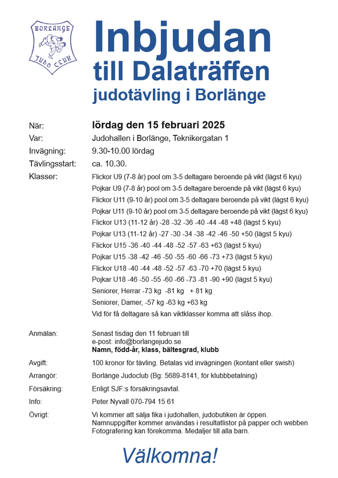 Vi har redan hunnit med vårterminens första pokaljakt i Borlänge för våra yngre barn. Jättebra kämpat och modigt att åka dit och prova. Det är mycket mer som kommer hända de närmaste månaderna. Dalaträffen (tävling): Nytt för denna termin är att inbjudningar till denna tävling kommer att gå ut till klubbar i närheten av vår region. 15:e februari - Borlänge -> Länk till PDF 22:a mars - Rättvik -> Mer info kommer senare Daladojo / RegionRandori - Borlänge (träning): 8:e februari 13.00 - 15.00 (RegionRandori) 21:a mars 18.00 - 20.00 (DalaDojo) 12:e april 18.00 - 20.00 (RegionRandori) Sportlovsläger i Borlänge 28/2 - 2/3 (Läger) Ett perfekt läger att börja med. Nära hem så man kan sova i egen säng. Ett jättehärligt läger där man får känna på gemenskapen i judovärlden. Information i denna PDF. Judofestivalen i Lindesberg 16/5 - 18/5 (Läger) Precis som sportlovslägret är det dagar fyllda med träning och goda judovänner. https://svenskjudo.smoothcomp.com/sv/event/19636 Vill ni ut och tävla på större arrangemang, prata med oss så hjälper vi till att kolla vad som passar. Facebook grupp Jag påminner om vår Facebook grupp "Gustafs Judo". Just nu är det inte så mycket aktivitet där, men förhoppningsvis blir det lite mer där framöver. Judo - Avancerad 12 jan 0kommentarer