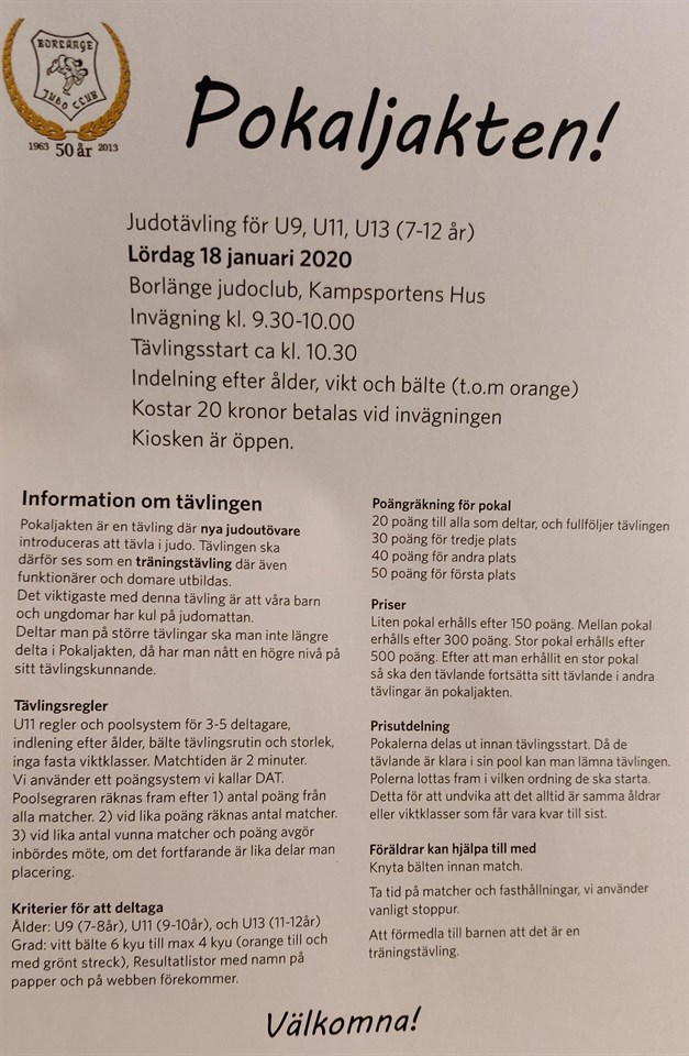 Borlänge Judo arrangerar pokaljakt på lördag 18:e januari, se bild för information. De som vill samlas utanför Gustafs Judo 8.50 och avfärd senast 09.00 för gemensam färd till Kampsportens hus i Borlänge. Lite kort om andra händelser under våren. Mer information om dessa när det närmar sig. Februari 15:e - Dalaträffen i Borlänge Februari 28:e-29:e - Sportlovsläger i Borlänge Mars 7:e - Pokaljakt i Rättvik April 25:e - Pokaljakt i Ludvika Maj 1:a-3:e - Judo5 [JudoFem] i Borlänge för Kvinnor U11, U13, U15, U18, +18 Maj 16:e - Sundsvallscupen Maj 17:e - Pokaljakt i Falun Maj 29:e-31:a - Judofestivalen i Lindesberg Det är även flera större tävlingar, t.ex. Södra Judo Open i Haninge,Stockholm, under våren. Har ni frågor eller funderingar på detta kontakta Jessica.