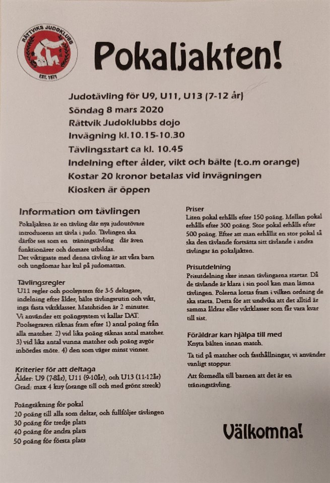 Rättvik har pokaljakt söndag 8/3 (inte lördag 7/3). Adress: Tholens väg 4, 795 32 Rättvik Se bild för mer information. De som vill samlas utanför judolokalen i Gustafs klockan 8.30 för avfärd senast 8.45 till Rättvik.