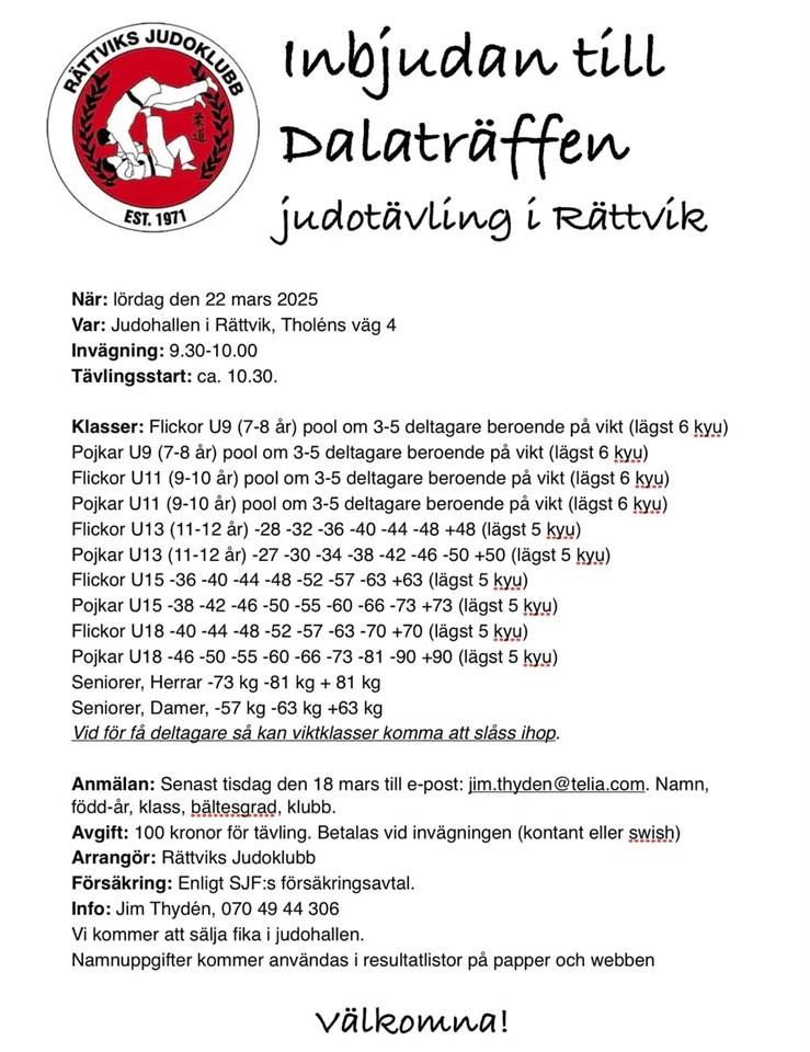 DalaTräffen i Rättvik 22:a mars (Tävling) Dalaträffen är en nybörjartävling. Reglerna är vanliga judoregler, dvs matchen är över när man fått Ippon (10 poäng). Anmälan senast tisdag den 18:e mars till Jim.thyden@telia.com Ange: Namn, född-år, klass (se bild), bältesgrad, klubb Mer information i bild till denna nyhet. Judo - Avancerad 11 mar 0kommentarer