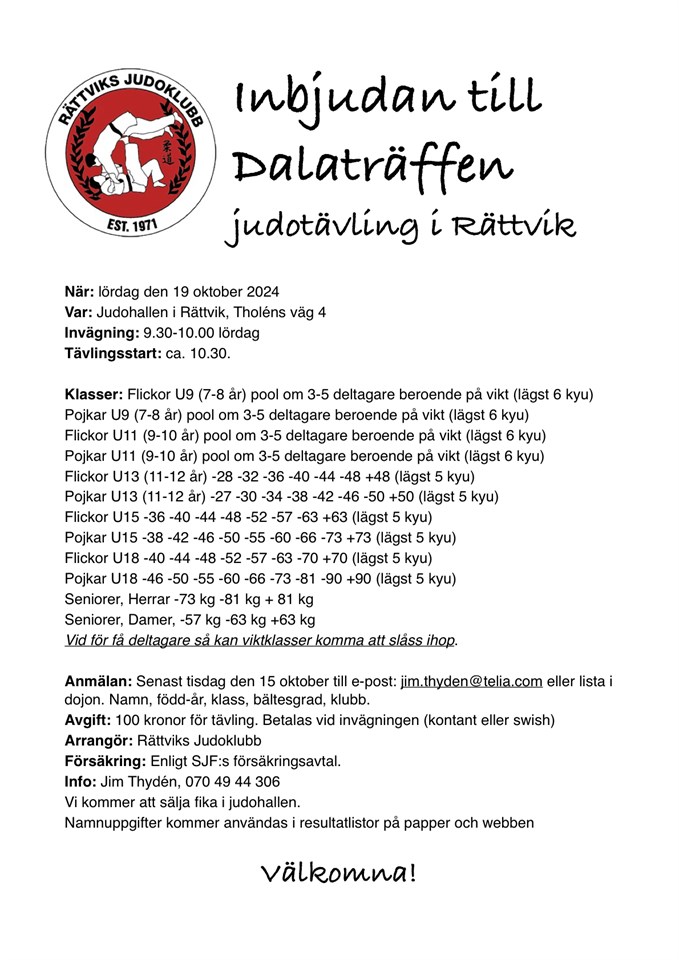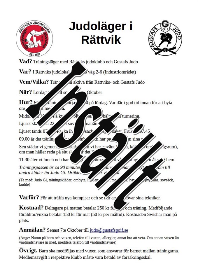 Se bild till denna nyhet. Rättviks Judoklubb och Gustafs Judo bjuder in aktiva i respektive klubb till ett litet läger. Barnet behöver ha en ansvarig vuxen med sig. Det betyder inte att varje barn måste ha varsin vuxen, om man följer med en kompis och föräldern till kompisen är ok med att ta det ansvaret går det bra. Vi tar gärna tidiga intresseanmälningar, men behöver få ett definitiv anmälan senast 7:e oktober till judo@gustafsgoif.se Återkom gärna med frågor.