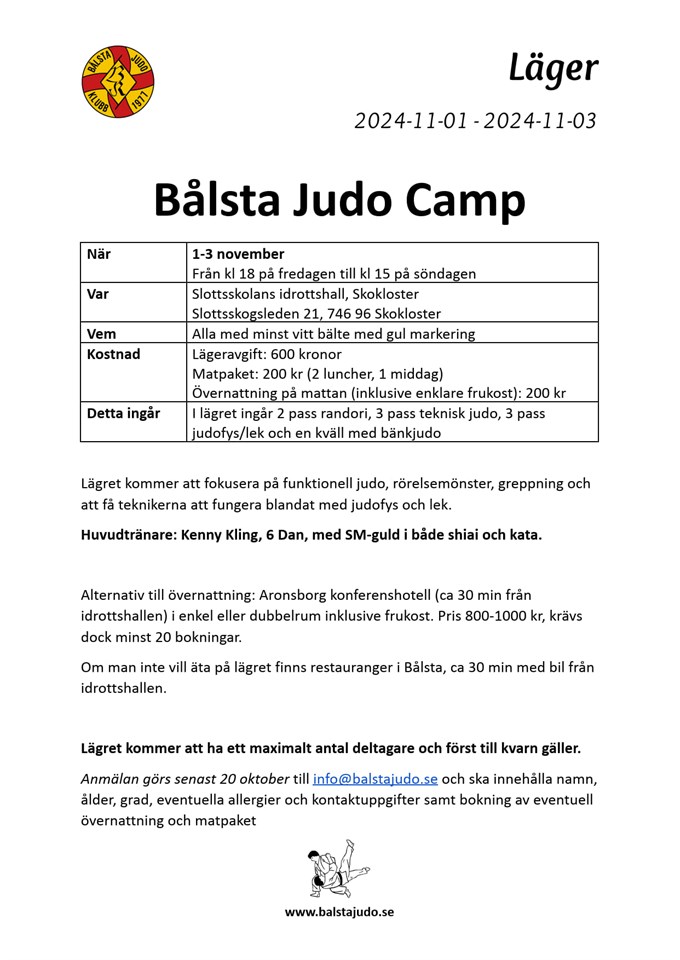 Bålsta Judo bjuder in till en helhelg med judo! När? 1-3 november Från kl 18 på fredagen till kl 15 på söndagen Var? Slottsskolans idrottshall, Skokloster Slottsskogsleden 21, 746 96 Skokloster Vem? Alla med minst vitt bälte med gul markering Kostnad Lägeravgift: 600 kronor Matpaket: 200 kr (2 luncher, 1 middag) Övernattning på mattan (inklusive enklare frukost): 200 kr Detta ingår: I lägret ingår 2 pass randori, 3 pass teknisk judo, 3 pass judofys/lek och en kväll med bänkjudo Lägret kommer att ha ett maximalt antal deltagare och först till kvarn gäller. Anmälan görs senast 20 oktober till info@balstajudo.se och ska innehålla namn, ålder, grad(bältesfärg), eventuella allergier och kontaktuppgifter samt bokning av eventuell övernattning och matpaket Mer information i denna PDF. I PDF:en finns på sidan 2 ett schema, medan bilden till denna nyhet bara visar sida 1.