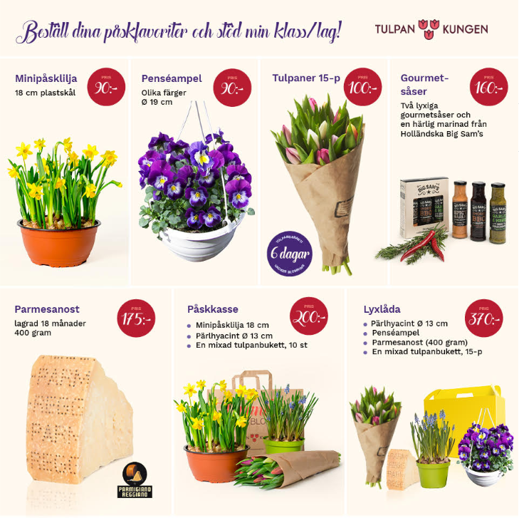 Hoppas att ni kommit i gång med försäljningen av påskblommor och parmesan! Tyvärr tror jag att Corona-viruset påverkar inte bara försäljning utan även leveranserna. I mitt fall får jag svårt att levererar blommor som beställts på jobbet då alla nu arbetar hemifrån. En utmaning men får kanske försöka att konvertera blomköparna till parmesanköpare. Det är idag fyra dagar kvar till sista beställningsdag. Vi får kämpa och göra vårt bästa nu i sluttampen. Bifogar en bild som ni kan dela på sociala medier så ni kan nå vänner och bekanta som ändå kan fungera att leverera till. För att vi ska få en uppfattning om hur försäljningen ligger till så ber jag er logga in på tulpankungen.se (inloggningsuppgifter på baksidan på det ena säljpappret) och registrera er försäljning hittills. Vad jag kan se så är det endast fyra spelarfamiljer som loggat in och registrerat ordrar. När ni har loggat in, går ni under "Ändra order" och skriver in den totala summan av resp. produkt i er försäljning. Exempel: Om Kalle och Lisa har köpt varsin tulpanbukett skriver ni alltså in 2 i rutan för tulpanbuketter. Bonusnivå 1 är 30 000 kr som jag hoppas att vi når upp till - då tjänar vi 1000 kr extra. Era ordrar måste vara registrerade senast torsdagen den 26/3 kl. 23:59 för att vi ska få med dem i försäljningen. Leverans den 2/4. Varorna hämtar ni hos Elviras familj på Sofiagatan 4b i Gustavsberg mellan den 2-4 april. Hör av er om ni har några frågor! /Annika 0733995939