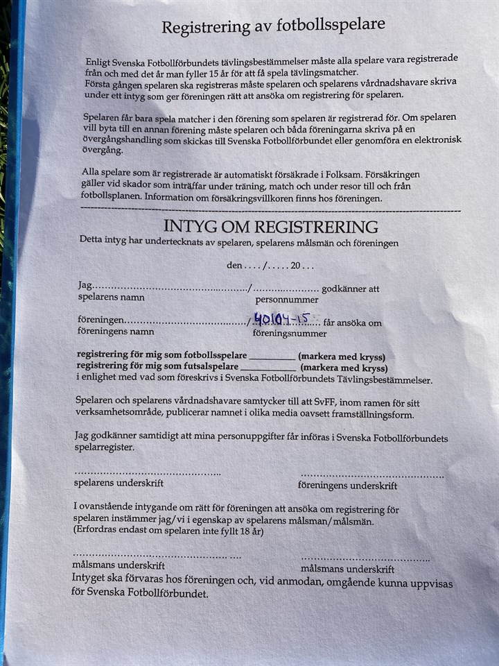 Enligt nya riktlinjer från Fotbollsförbundet måste spelare vara registrerade från och med det år man fyller tolv år (trots att det på blanketten står 15 år). Vi ber därför alla att fylla i blanketten som vi delar ut på träningen den här veckan och lämna in till oss igen så snart ni kan. I fältet där föreningsnummer ska fyllas i får ni väldigt gärna skriva 40104-15. Kom ihåg att både spelare och målsman måste skriva under för att registreringen ska bli giltig. Vänligen Tränarna U17 8 jun 2020 0kommentarer