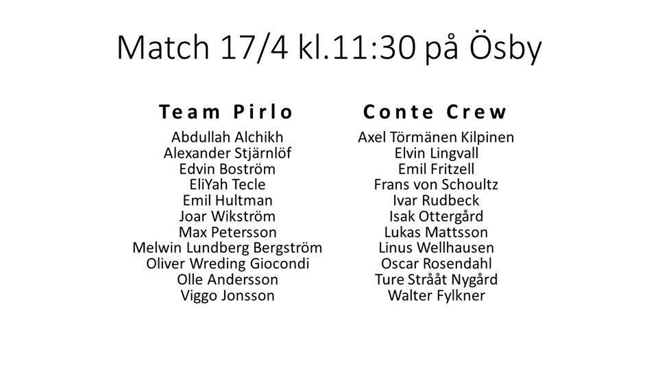 Ett soligt Ösby välkomnade oss för årets första match. Även om det var en internmatch märktes det tydligt att det var något annat än ännu en träning. Killarna var laddade och ivriga att äntligen få spela. Conte öppnade bäst och tog sig fram till fina lägen och hörnor, dock utan att kunna få hål på Pirlo som inte heller var ofarliga när de ställde om i sanbba kontringar. Det var mållöst efter första perioden men det kändes tydligt att det skulle bli mål i matchen. Det dröjde ända till 19:e minuter i andra perioden innna Conte genom hög press kunde sno åt sig bollen i Pirlos straffområe och göra 0-1 genom Emil Fritzell. Pirlo hade dock spelat upp sig lite och svarade i periodens sita minut då Abdullah Alchikh passade fram Emil Hultman som kunde kvittera. Det var ett så kallat psykologiskt viktigt mål som gav Pirlo bra energi att ta med sig in i sista perioden. I sista perioden märktes det att frånvaron av matchande tog ut sin rätt. Och tuffast var det för Conte som inte riktigt orgkade hålla spelet uppe. Pirlo drev dock på och fick efter 13 minuter utdelning när ett Pirloinlägg styrdes in i eget mål av en Contespelare. Ganska direkt efter det kunde Emil Hultman göra ett läckert 3-1. Med tre minuter kvar av matchen fastställdes slutresultatet då Emil Hultman kunde göra 4-1 från halva planen när han påpassligt noterade att contes målvakt stod långt ut. En bra match med mersmak där samtliga 22 spelare har skäl att ta med sig bra situationer inför kommande säsong. Se matchen här: https://solidsport.com/gifp08/watch/gustavsbergs-if-fk-p-08-bagarmossen-karrtorp-bk-p-08-17-apr-11-33-12-58 U17 17 apr 2021 1kommentar