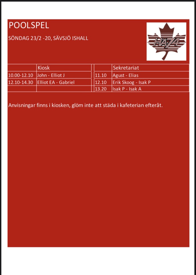 Hej! Här kommer schema för kiosk och sekretariat till söndagens poolspel här hemma. Då vi inte är så många i laget så måste vi försöka att använda de resurser vi har. Vi behöver även hjälp med sargen före och efter, samt rökmaskin och lampor till introt. Vi hoppas att några föräldrar kan ställa upp och hjälpa till med detta. Hockeyhälsningar, Putte, Nicke, David Team 11 2023-24 18 feb 2020 0kommentarer