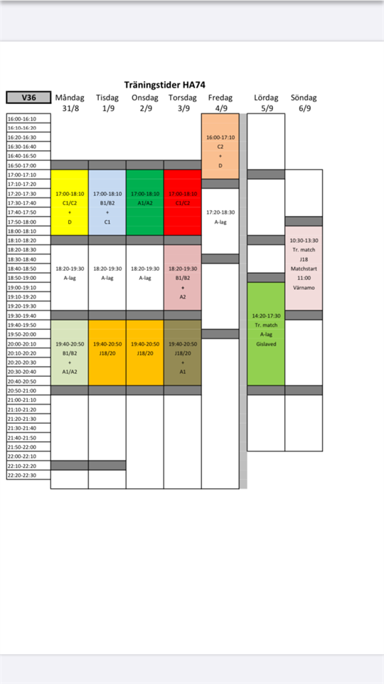 Hej, följande träningstider är det som gäller de kommande 2 veckorna. v. 37 Onsdag 9/9 kl 17.00-18.10 Lördag 12/9 kl 08.30-09.50 V.38 Tisdag 15/9 kl 17.00-18.10 Lördag 19/9 kl 08.30-09.50 Bästa hälsningar, Patrik, Nicke, David