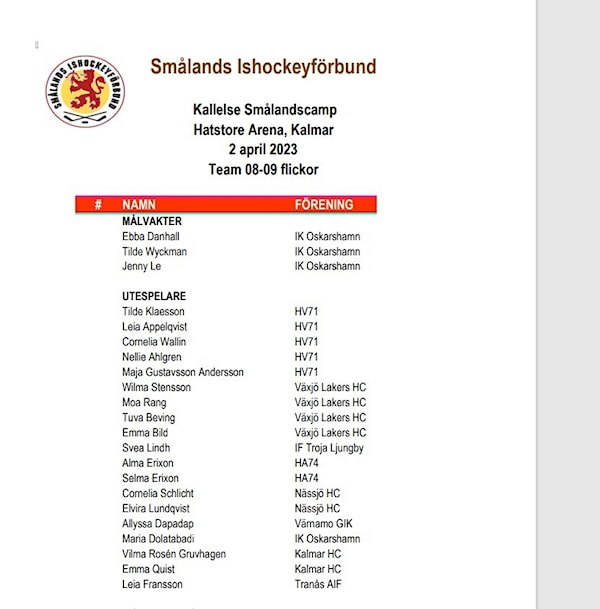 Smålands Ishockeyförbund kallar spelare team 08-09 flickor till Smålandscamp den 2 april i Kalmar