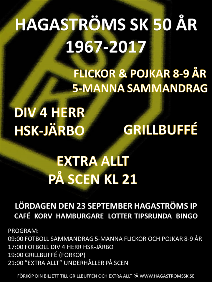 Här kommer en påminnelse att det är hög tid att anmäla sig till Hagaströms SK's 50 årsfirande. Många har redan anmält sig men än finns det gott om plats i partytältet! DU BEHÖVER ANMÄLA DIG TILL KVÄLLENS BUFFÉ SENAST DEN 17 SEPTEMBER. Lördagen den 23 september firar vi stort på Hagaströms IP med start kl 09:00 med 5-manna fotbollssammandrag flickor och pojkar 8-9 år hela dagen. Caféet är öppet och servering med bl a grillade hamburgare. Under dagen kan du gå en klassik motionsbingo eller en tipspromenad i vårt motionsspår med fina priser. Kl 17:00 är det dags för mer fotboll i div 4 herr mellan HSK-Järbo. Som vanligt viktiga poäng på spel. Efter matchen svidar vi om till fest. Vi dukar upp en härlig grillbuffé i partytält med start ca kl 19:00. För att säkra en plats till grillbuffén behöver ni köpa buffébiljett. Firandet avslutar vi med att gruppen "Extra Allt" spelar på scenen kl 21:00. Du förköper dina biljetter till grillbuffén och "Extra Allt" genom att sätta in 250 kr/pers på HSK pg-konto 232325-1 eller Swish till nummer 123 452 8469. Var noga med att ange "HSK50" samt namn och antal personer som referens på din betalning. I grillbuffén ingår även dryck till maten samt att det kommer finnas en bar öppen om du önskar handla något mer. Med vänlig hälsning HSK's Huvudstyrelse