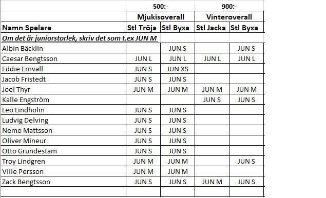 I dag kom äntligen overallerna till er som beställt! Några hann få dem på träningen idag och resterande ligger i en kartong i förrådet. Priser - Vinteroverall: 900 kronor - Mjukisoverall: 500 kronor Halva priset gäller om man bara valt en del av overallen, jacka eller byxa. Swisha betalningen till lagkassan på 072 - 248 56 78. Märk den med spelarens namn samt "Overall" Ni som har intjänade parkstädningspengar kan använda dessa för att betala overallen om ni vill. Meddela Tobias Mattsson det i så fall (inte som kommentar på nyhet eller via gästboken) utan via sms eller mail. I den bifogade bilden ser ni vad ni beställt. Team-09 7 nov 2019 0kommentarer