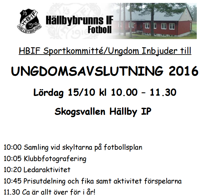 Hej! Klubben har ungdomsavslutning den 15 oktober. Se bifogat dokument under "dokument" för mer information /Nicklas
