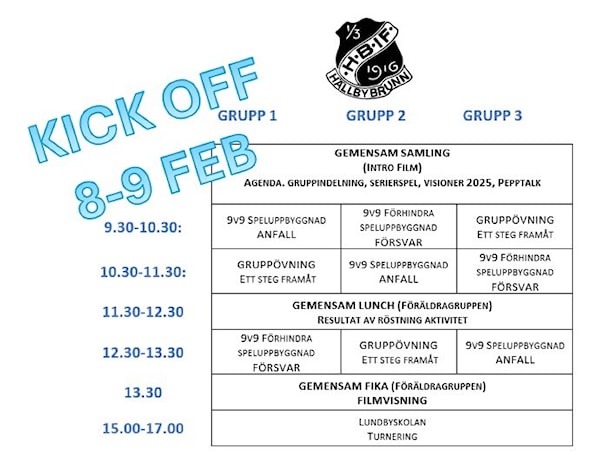 Söndag: Samling på Kupan kl. 09.00 för gemensamma aktiviteter med fokus på kommande 9v9-säsong och vårt sätt att spela, samt kanske det viktigaste av allt, lära känna varandra bättre och få trygghet inom gruppen.