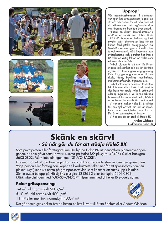 Upprop! Vår insamlingskampanj till planrenoveringen har arbetsnamnet "Skänk en skärv" och det är för att lyfta fram att vi befinner oss i ett avgörande läge om föreningens framtida överlevnad. "Skänk en skärv! Idrottskamrater i nöd" är en rubrik från ett Hälsö BK år 1935 då man befann sig i ett mycket svårt ekonomiskt läge för att kunna färdigställa vår anläggning och genom ideellt arbete och ekonomiskt stöd övervann man svårigheterna och därefter har Hälsö BK varit en viktig faktor för Hälsö som ett levande samhälle. Fotbollsplanen är ett nav för föreningens verksamhet och det är därifrån mycket av föreningens engagemang föds. Engagemang som leder till simskola, dans, bowling, musikaftnar, midsommarfirande, Stjärnan m.m Fotbollsplanen är också en fantastisk lekplats som vi har i vårat närområde där barn kan spela fotboll, brännboll eller springa fritt. Vi vill kunna erbjuda barnen att fortsätta med detta, både i organiserad form och för spontan lek! Vi tror att ni tycker Hälsö BK är viktigt för öns själ oavsett om det är idrott, kultur eller festligheter som lockar. Det är en gemenskap vi bygger! Vi hoppas på ditt stöd till Hälsö BK Anders Olofsson Ordförande Hälsö BK Se länk; http://www.laget.se/HALSOBK/Document/Download/-1/4238760