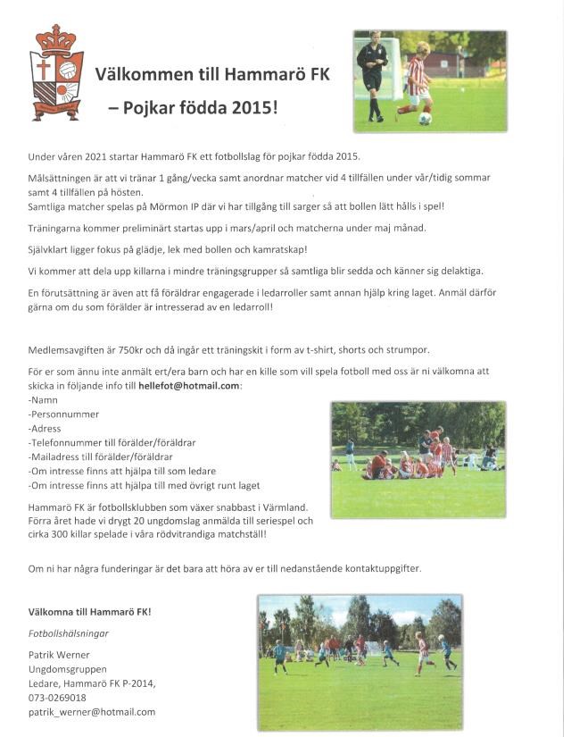 Under våren 2021 startar Hammarö FK ett fotbollslag för pojkar födda 2015. Målsättningen är att vi tränar 1 gång/vecka samt anordnar matcher vid 4 tillfällen under vår/tidig sommar samt 4 tillfällen på hösten. Samtliga matcher spelas på Mörmon IP där vi har tillgång till sarger så att bollen lätt hålls i spel! Träningarna kommer preliminärt startas upp i mars/april och matcherna under maj månad. Självklart ligger fokus på glädje, lek med bollen och kamratskap! Vi kommer att dela upp killarna i mindre träningsgrupper så samtliga blir sedda och känner sig delaktiga. En förutsättning är även att få föräldrar engagerade i ledarroller samt annan hjälp kring laget. Anmäl därför gärna om du som förälder är intresserad av en ledarroll! Medlemsavgiften är 750kr och då ingår ett träningskit i form av t-shirt, shorts och strumpor. För er som ännu inte anmält ert/era barn och har en kille som vill spela fotboll med oss är ni välkomna att skicka in följande info till kanslisten på mail: hellefot@hotmail.com -Namn -Personnummer -Adress -Telefonnummer till förälder/föräldrar -Mailadress till förälder/föräldrar -Om intresse finns att hjälpa till som ledare -Om intresse finns att hjälpa till med övrigt runt laget Hammarö FK är fotbollsklubben som växer snabbast i Värmland. Förra året hade vi drygt 20 ungdomslag anmälda till seriespel och cirka 300 killar spelade i våra rödvitrandiga matchställ! Om ni har några funderingar är det bara att höra av er till nedanstående kontaktuppgifter. Välkomna till Hammarö FK! Fotbollshälsningar Patrik Werner Ungdomsgruppen Ledare, Hammarö FK P-2014, 073-0269018 patrik_werner@hotmail.com P 10 (P-2015) 2 feb 2021 0kommentarer
