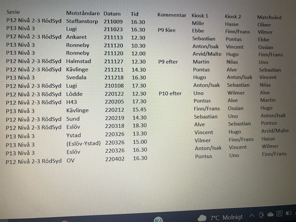 Här är kioskschemat för våra hemmamatcher . Kan ni inte ta ert pass så försök byta med någon annan .