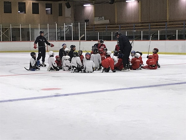 Hela hockeyskolan tränar gemensamt och vill man som förälder vara i båset så är det ok.