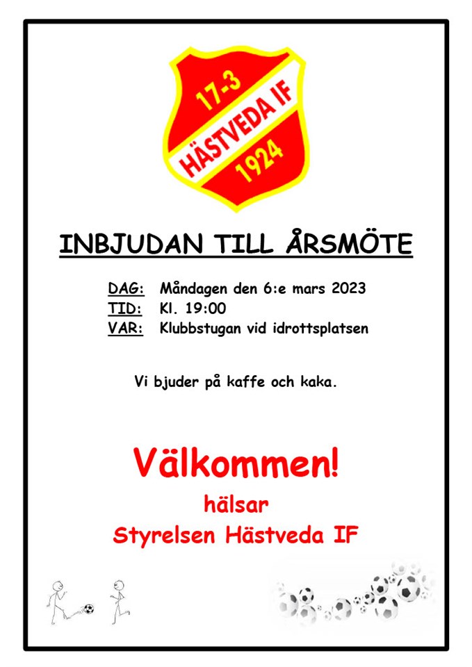 På årsmötet 6/3-23 beslutade vi om nya medlemsavgifter för 2023. 0 – 8 år: 300 kr 9 – 14 år: 500 kr 15 – 18 år: 700 kr 19 år - äldre: 1000 kr Familj: 1000 kr (gäller till och med 18 år) Ledare: 100 kr Bli gärna stödmedlem: 100 kr Medlemsavgiften ska vara betald senast fre 14/4, gärna via swish: 1232329431 (uppge spelarens namn och lag) Alternativ betalning: via vårt BG 741-2141 Det är obligatoriskt för alla aktiva att betala sin medlemsavgift för att få deltaga i träningar och matcher . OBS! SÄG TILL ERA LEDARE NÄR AVGIFTEN ÄR INBETALD Som familj, ledare och stödmedlem så uppge namn och telefonnummer vid betalning. Hälsningar Hästveda IF:s styrelse och ledare