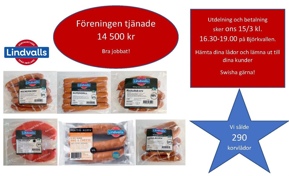 Nu är det dags att sälja Lindvalls korvlåda! Det går till så här: Sälj så många korvlådor som möjligt. När du tar upp beställningen ska du också ta betalt. Korvlådan kostar 270 kr och för varje såld korvlåda tjänar föreningen 50 kr. Senast onsdag 22 februari ska du informera din tränare/ledare hur många korvlådor du sålt. Därefter beställs korvlådorna och utdelning sker på Hästveda IP Björkvallen onsdag 15 mars kl. 16.30-19.00. Samtidigt som du hämtar dina korvlådor swishar du dina intjänade pengar till 1232329431. Som alternativ går det också bra att du tar med dig dina intjänade pengar i ett kuvert som du märker med ditt namn och vilket lag du spelar i. Vi förespråkar dock swish! Du hämtar dina beställda korvlådor och delar ut till dina kunder. Korvlådan innehåller 6 produkter (totalt 3,89 kg) • BBQ & Cheese 300g • Rishultskorv 330g • Grillkorv tjock 900g • Wienerkorv 600g • Supergrillare 960g • Falukorv 800g Lycka till med försäljningen! Hälsningar Styrelsen