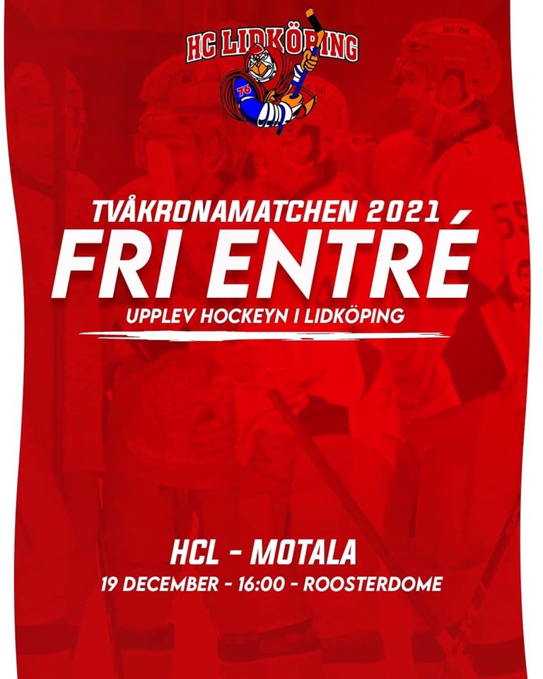Dags för årets tvåkrona-match! Det innebär att det är gratis entré till matchen för samtliga besökare och ju fler vi kan vara på plats desto mer intäkter genereras till föreningen. • Söndag 19 december • klockan 16:00 • HC Lidköping - Motala Du måste ha ett giltigt vaccinationsbevis för att komma in i ishallen. Passa på att se på bra hockey och samtidigt stötta HCL. Hjärtligt välkomna. A-lag 15 dec 2021 0kommentarer