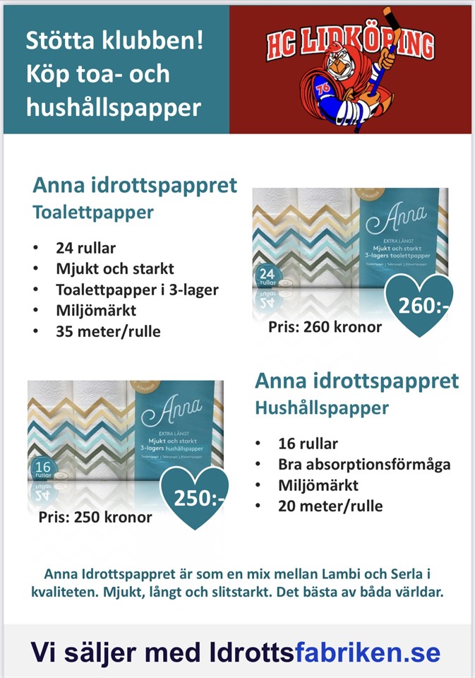 Tiden går fort. Vi är nu inne i slutet av period 2 av vår försäljning av Toa- och hushållspapper. Närmare bestämt 15 minuter in i 2:a. Vad står det då? Försäljningen flyter på bra men mycket återstår för att vi skall vinna matchen. Alla vet att det är i 3:e perioden som allt avgörs. Hoppas ni förstod min metafor:) Nu håller vi uppe ångan och ökar trycket ända in i mål. Sista datum för att redovisa försäljningen är den 24/11 Hej alla medlemmar, föräldrar och övriga hockeyvänner! Nu är det dax för vår årliga försäljning av Toa- & Hushållspapper. Försäljningen pågår under tre veckor i november. Nytt för i år är att vi valt ett nytt märke som är framtaget för att säljas genom idrottsklubbar. Det heter Anna Idrottspappret. Ett papper som är en mix mellan Lambi och Serla i kvaliteten. Mjukt, långt och slitstarkt. Det bästa av båda världar. Balarna innehåller något fler meter papper än de vi tidigare sålt. Mer papper för pengarna helt enkelt! Priset till kund är konkurrensmässigt. Säsongen är i fullgång, många matcher och träningar för både killar och tjejer. För att vi skall fortsätta ha en hög kvalité och många träningstillfällen för våra ungdomar behövs en god ekonomi. Tre viktiga arbeten, för att kämpa in pengar till klubben, återkommer varje år. (En eller två ggr per säsong) New Body, 2-kronan, Toa- & Hushållspapper. Alla skall känna glädje av att hjälpa till och därför är det frivilligt att sälja så många balar man vill. Allt vi gör, gör vi tillsammans. Målet är att varje medlem ska försöka sälja 5 balar var. Spelar ingen roll om det är Toa- eller Hushållspapper. Jag tror vi kan slå nya rekord om alla känner sig delaktiga och när vi jobbar mot gemensamma mål. Sälj till familj, grannar, vänner, bekanta, arbetsplatser och företag. Lägg upp på era sociala medier att det pågår försäljning av Toa- & Hushållspapper. Vi erbjuder gratis leverans till företag, i Lidköping med omnejd, vid köp av mer än 10 balar. Vi har två sätt att beställa - [ ] Digitalt Tryck på Länken nedan för Google Formulär och fyll i alla era uppgifter. Namn, vilken sorts papper, lagenhet etc. - [ ] Analogt Tryck på Länken nedan för Beställningslista och fyll i alla era uppgifter. Namn, vilken sorts papper, lagenhet etc. Senast den 24/11 vill vi ha in listorna. Både Digitalt(Google Formulär) och Analogt(Lägg dem i ett plastfack märkt ”Försäljning papper” i första rummet, innan kansliet) Leverans kommer ske ngn vecka in i december. Återkommer om exakta datum. Glöm inte skriva upp vilken lagenheten du tillhör, då vi kommer bjuda på Pizzakväll till den lagenheten som sålt mest. Lycka till med försäljningen Patrick Demegård Genom HC Lidköpings styrelse Stöd HC Lidköping Kvittomall Företag