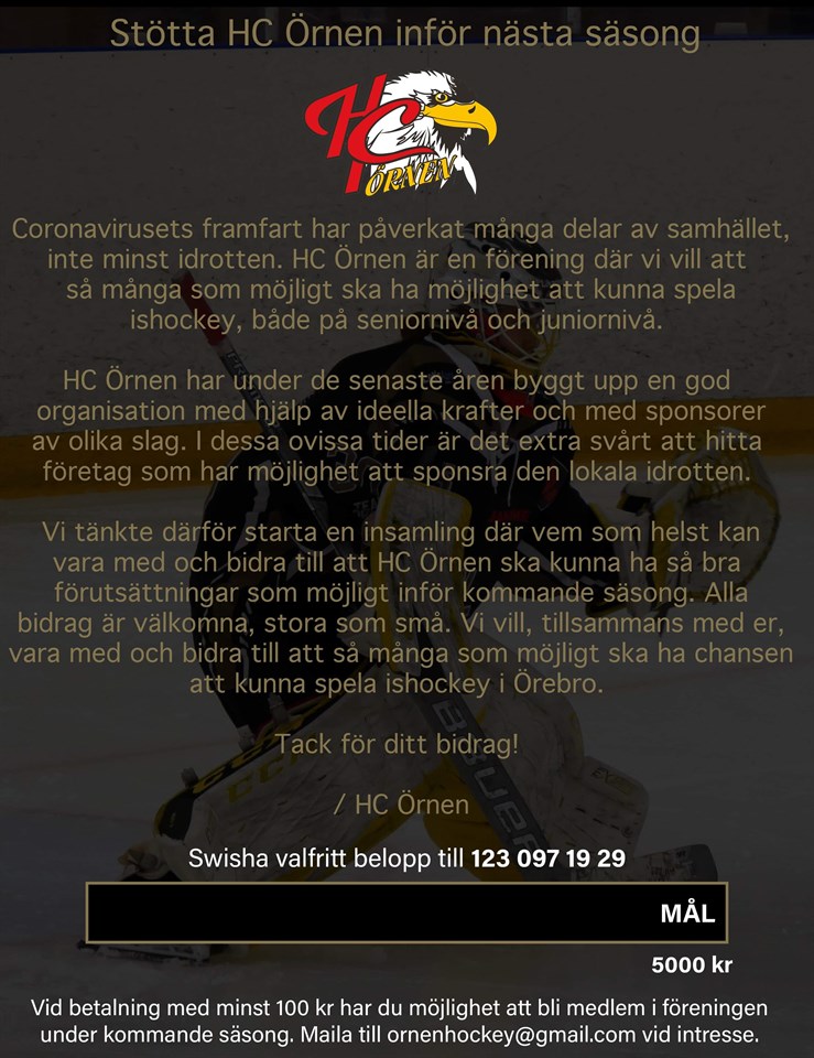 Coronavirusets framfart har påverkat många delar av samhället, inte minst idrotten. HC Örnen är en förening där vi vill att så många som möjligt ska ha möjlighet att kunna spela ishockey, både på seniornivå och juniornivå. HC Örnen har under de senaste åren byggt upp en god organisation med hjälp av ideella krafter och med sponsorer av olika slag. I dessa ovissa tider är det extra svårt att hitta företag som har möjlighet att sponsra den lokala idrotten. Vi tänkte därför starta en insamling där vem som helst kan vara med och bidra till att HC Örnen ska kunna ha så bra förutsättningar som möjligt inför kommande säsong. Alla bidrag är välkomna, stora som små. Vi vill, tillsammans mer er, vara med och bidra till att så många som möjligt ska ha chansen att kunna spela ishockey i Örebro. Vi har som målsättning att få in 5000 kr och om summan blir högre än detta så är det en bra bonus. Swisha valfritt belopp till 123 097 19 29 om du vill vara med på denna resa. Vid betalning med minst 100 kr har du möjlighet att bli medlem i föreningen under kommande säsong. Maila till ornenhockey@gmail.com vid intresse. Tack för ditt bidrag! / HC Örnen