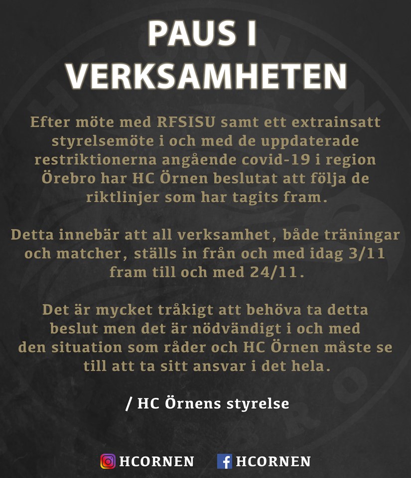 HC Örnen pausar all verksamhet. Efter möte med RFSISU samt ett extrainsatt styrelsemöte i och med de uppdaterade restriktionerna angående covid-19 i region Örebro har HC Örnen beslutat att följa de riktlinjer som har tagits fram. Detta innebär att all verksamhet, både träningar och matcher, ställs in från och med idag 3/11 fram till och med 24/11. Det är mycket tråkigt att behöva ta detta beslut men det är nödvändigt i och med den situation som råder och HC Örnen måste se till att ta sitt ansvar i det hela. / HC Örnens styrelse