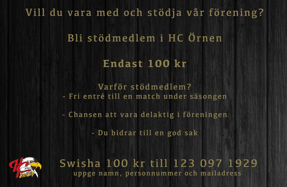 Nu har du chansen att bli stödmedlem i HC Örnen. För endast 100 kr kan du bli delaktig i föreningen, du bidrar till en god sak samt att du får gratis entré till en av våra hemmamatcher under säsongen. Varje medlem är till stor hjälp för hela föreningen! Varmt välkommen som stödmedlem i HC Örnen! / HC Örnen
