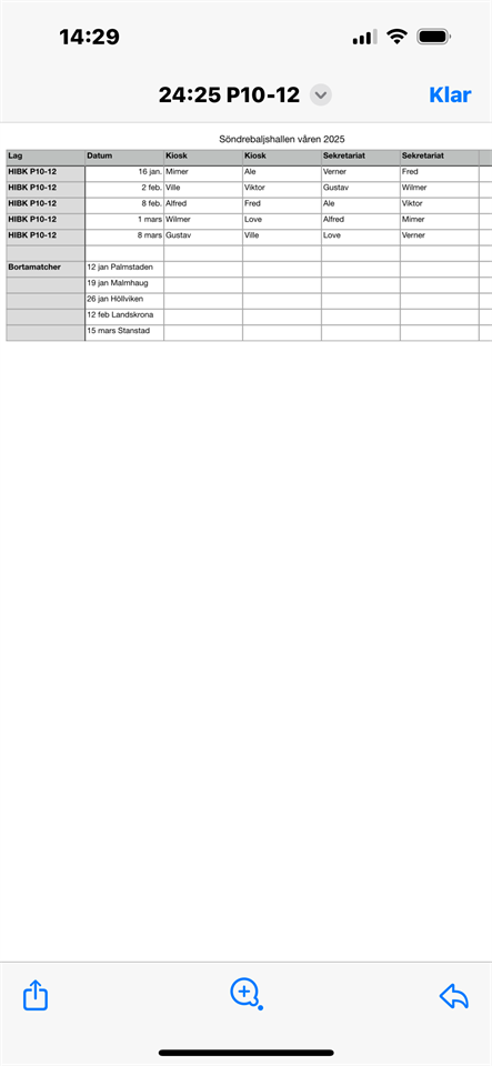 Hej Vi har 5 hemma matcher nu i vinter där vi står som arrangör och behöver hjälp med bemanna kiosk och sekretariat under dessa matcher. Vi har gjort en fördelning enligt bifogad bild. Är det så att ni inte kan av olika anledningar så går det bra att byta med varandra men det får ni sköta mellan er. Har ni frågor så är det bara att höra av er till Marcus eller John Med vänlig hälsning, Marcus & John Pojkar födda 10-12 6 jan 4kommentarer
