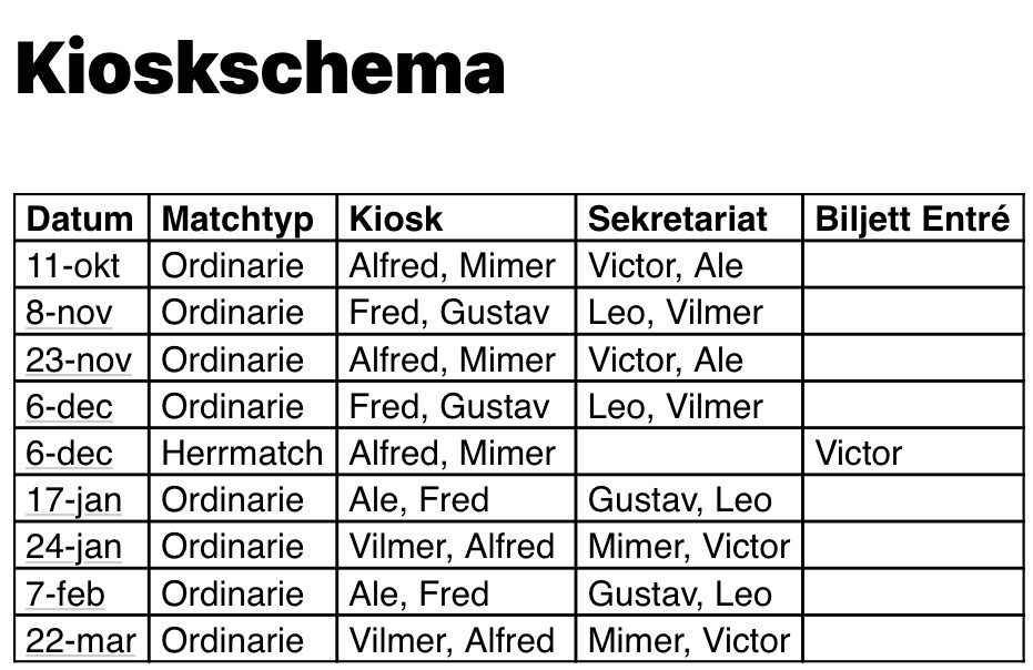 Hej allihopa, Nu drar innebandysäsongen äntligen igång, och i samband med det behöver vi er hjälp med bemanning av sekretariatet och kiosken under våra hemmamatcher. Fördelningen av passen finns bifogad i detta mejl. Ta gärna en titt och notera vilka datum som gäller för just er. Om ni skulle få förhinder, försök att byta med någon annan i laget och meddela oss om ändringen. Tack för att ni ställer upp – tillsammans gör vi säsongen möjlig för våra spelare! Har ni frågor så är det bara att komma till oss tränare. Vänliga hälsningar, Tränarna Pojkar födda 10-12 17 sep 1kommentar