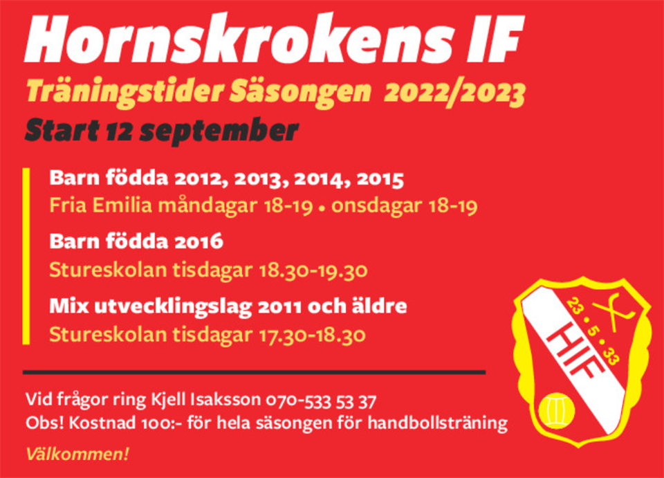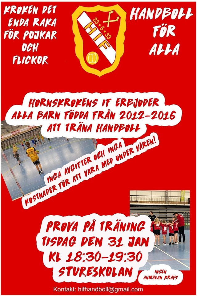 Hornskrokens IF bjuder in alla pojkar och flickor födda 2012-2016 att träna handboll. Vi kallar det Handboll för alla. Träna och spela hela våren utan avgifter eller andra kostnader. Vi börjar med en prova på träning tisdagen den 31 januari 18.30-19.30 på Stureskolan. Ingen anmälan krävs. Vid frågor: hifhandboll@gmail.com