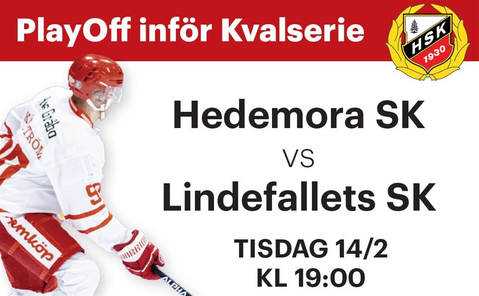 Det står nu klart vilket motstånd vi får möta i playoffet inför Kvalserien till HockeyTvåan. Det är en tidigare bekant från HockeyTvåan-tiden som också likt oss tillhört trean iår. Vi pratar om hälsingegänget Lindefallets SK. Matchserien spelas i bäst av tre och börjar Tisdag 14 februari med match på hemmais i Hemköp Arena för att sedan spela borta Fredag och eventuellt Söndag om en tredje avgörande krävs. Hedemora SK - Lindefallets SK Tisdag 14/2 kl 19:00 Hemköp Arena Lindefallets SK - Hedemora SK Fredag 17/2 kl 19:30 PF Arena Lindefallets SK - Hedemora SK Söndag 19/2 kl 16:00 PF Arena (Spelas endast vid 1-1 i matcher) Vinnaren är sedan klar för Kvalserie till HockeyTvåan. Förloraren får tacka för säsongen och ta nya tag!
