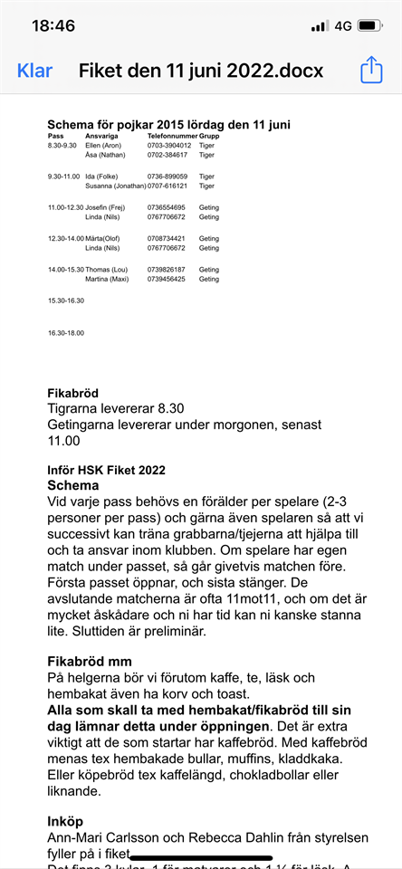 I den bifogade bilden finns schema med telefonnummer till de som ska stå i fiket i morgon. Ni som ska lämna fika gör det från 8.30 men senast 11.00. Fikat ska lämnas i fiket vid BP. Nu hoppas vi på god förtjänst! Tack alla ni som ställer upp och bemannar och levererar fika. Linda