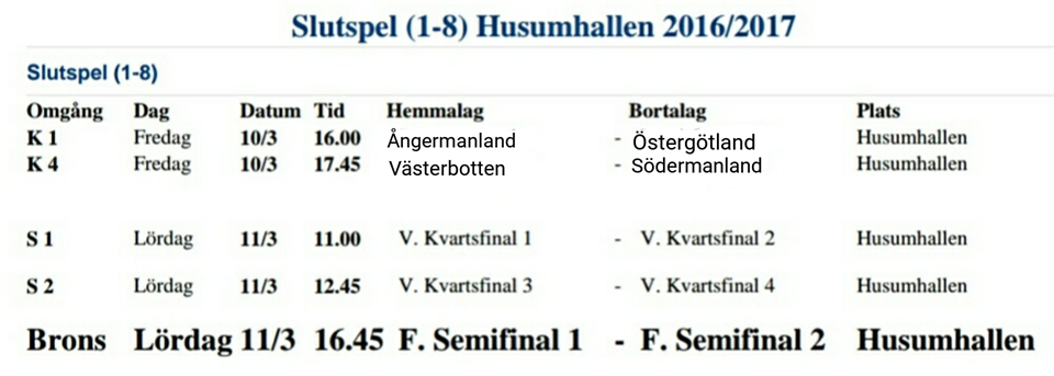 Kl.11:00 startar semifinalspelen på Husumhallen i 2017 års upplaga av Stålbucklan. Och vilken turneringen det har varit så här långt! Matcherna som spelas under dagen i vår hall är; 11:00 Ångermanland vs Västergötland/Bohuslän-Dalsland 12:45 Gästrikland/Hälsingland vs Södermanland 16:45 Bronsmatch Det är otroligt roligt att vi i Husum och vår Husumhallen får vara med och annordna en så här fin tillställning. Lördag och ledigt? kom till Husum och fyll vår hall! Finalen spelas söndag på Fjällräven center #stålbucklan #Husumhallen