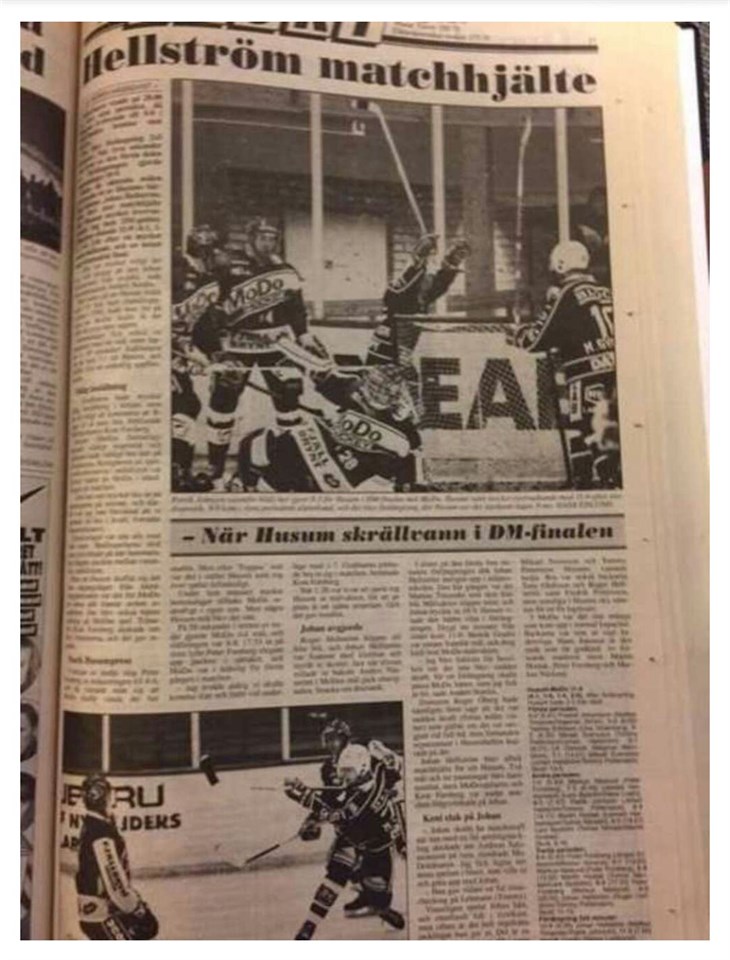 1992 tvålade Husum Hockey dit Modo i DM final och så här skriver Pär Hägglund i dagens ÖA, DM-finaler vi minns – publikfesten, Foppas comeback och kalabaliken i Husum. Högst upp på Per Hägglunds lista; 1. Husum Hockey-Modo Hockey 11–9 (1992) I mina ögon DM-finalens moder, och även då var Peter Forsberg med. Liksom Markus Näslund, Andreas Salomonsson, Lasse Byström, Miloslav Horava, Martin Hostak och många andra Modogiganter. Ja, Mattias Timander lirade också, men i Husum. Huvudrollen stals dock av Johan Hellström som var het som ett strykjärn, körde över allt och alla, retade gallfeber på far och son Forsberg, Peter och Kent, och naturligtvis avgjorde han finalen också. Han samlade också ihop till två mål och tre assist. Husum fick starta med en 3–0-ledning och chockade elitserielaget genom att göra tre snabba mål i inledningen av den första perioden. Modo kom dock i kapp och förbi genom ett par mål av både Forsberg och Näslund innan Johan Hellström kvitterade i matchens sista sekund. Sedan blev det förlängning 2x5 minuter och då slog Hellström till igen innan Modobekantingen Henrik Gradin gjorde 11–9 för Husum. Johan Hellström var glad, hemmapubliken överlycklig och Kent Forsberg var rasande. Så här sa han till ÖA efter matchen. – Johan skulle ha matchstraff när han med en ful armbågstackling skickade ner Andreas Salomonsson på isen. Jag fick lugna ner mina spelare i båset, som ville in och göra upp med Johan, sa Kent Forsberg. Det hade nog Johan Hellström inte haft något emot... – Den där matchen glömmer man inte. Det var ett jäkla liv, minns Johan. Källa på statistiken: Modohjerta.se