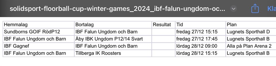 Godfortsättning, hopps ni alla har haft en underbar jul. Nu har kallelse gått ut för cupen matcherna. Alla killar som hade anmält intresse att vara med bör nu ha fått kalleles till 2 matcher var. Jag ber er svara på kallelsen så jag vet att ni har sett den och att ni har för avsikt att vara med, annars vill jag fylla upp så vi inför varje match för med full laguppstälning med 14 personer. Vi har även delat upp våra ledare något så Malin & Frida kör den 27/12 och Daniel och Stefan kör den 28/12. Men högst sannorlikt ser ni oss alla i hallen båda dagarna. Det vill jag även uppmuntra att killarna är med på alla matcher och att när de inte spelar så hejar vi på vårt lag. Vi har endast ett lag anmält i år så de är alla med i samma lag men bidrar vid olika tider. Hur slutspelat ser ut kan ni se om ni följer bifogad länk. https://solidsportfloorballcupwintergames.cups.nu/2024,sv/result/team/57410850 Jag ska försöka hålla er uppdaterade här, men även toppen om ni håller ett öga själva. I bland går det snabbt. Killarna behåkller sin matchtröja under hela cupen och lämnar in den när de spelat klart. Hör gärna av er om något känns oklart. Vi ses i hallen P2012 25 dec 2024 1kommentar