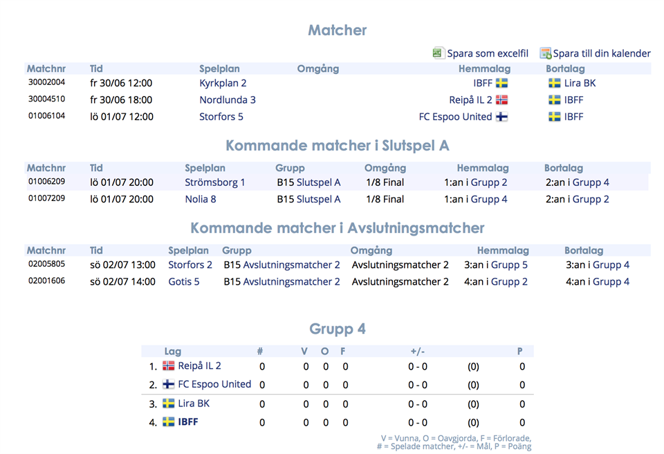 Matcher fre 30/6 12:00 Kyrkplan 2 IBFF - LIRA BK fre 30/6 18:00 Nordlunda 3 Reipå IL2 - IBFF lör 1/7 12:00 Storfors 5 FC Espoo United - IBFF