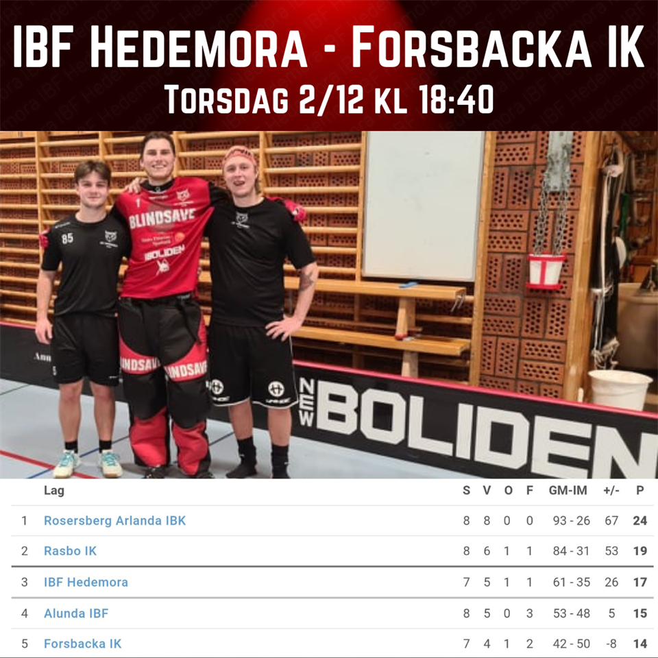 På torsdag kl 18:40 gästas vi av tabellfemman Forsbacka IK. Vi ligger för närvarande på en tredjeplats i tabellen. Med andra ord så är det en mycket betydelsefull match som väntar! Forsbacka är likt oss väldigt hemmastarka och har programenligt vunnit båda sina hemmamatcher. Man har också vunnit tre bortamatcher. I Gästrikelaget finns det mycket rutin sedan tidigare och man har dessutom nyligen fått tillbaka duktige Max Vidlund från allsvenska Sätra IK. Dessutom har man lyckats värva in backen Jhann Aldén från IBK Runstens division 1 lag. I Hedemora har unge backen Joel Jonsson Evaldsson utvecklats starkt under hösten och debuterar nu i division 2. För övrigt ser målvakten Linus Hansson stark ut och backjätten David Fjellström fortsätter att imponera. Vi räknar med en klart tuffare match än den senaste hemmamatchen och hoppas på fortsatt starkt stöd från publiken även denna gång. Må det bästa laget vinna! Kom ihåg att nu gäller det att ta med vaccinationsintyg samt legitimation för att komma in på matcherna enligt gällande restriktioner. Intyget kan hämtas HÄR!. Från och med denna match gäller även de nya entrépriserna. Alla ungdomar t.o.m. 17 år, föreningens licensierade spelare samt ledare bjuds på inträdet!