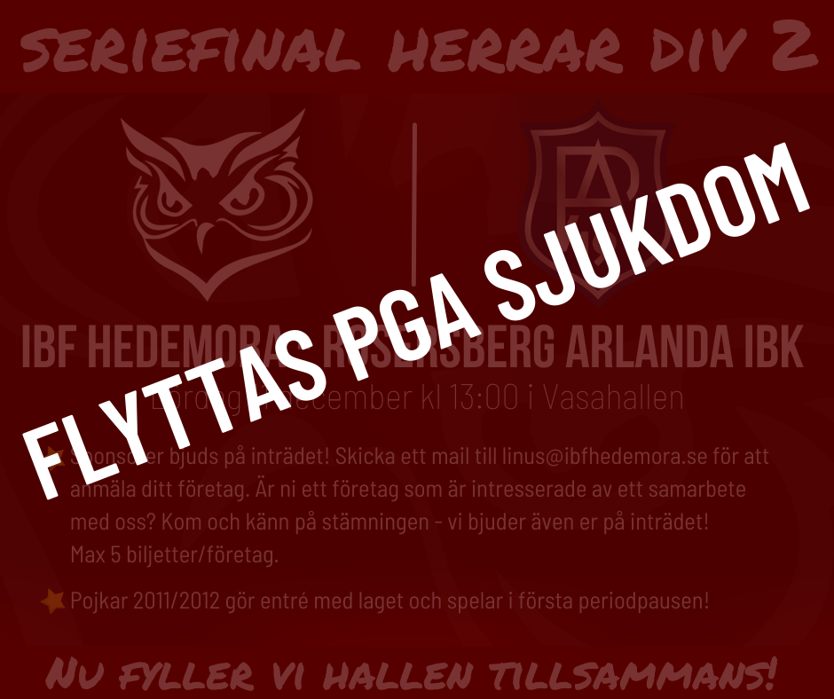 Så har det då hänt igen. Tyvärr måste vi meddela att lördagens seriefinal mellan IBF Hedemora och Rosersberg Arlanda kommer att flyttas. Detta på grund av sjukdom i motståndarlaget. Vi beklagar detta och hoppas på er förståelse i dessa tider. Har ni redan köpt biljetter till denna match kommer dem att gälla då matchen spelas. När det blir är inte bestämt i skrivande stund. Vill ni istället ha återbetalning - kontakta då: annelie@ibfhedemora.se alternativt via våra sociala medier