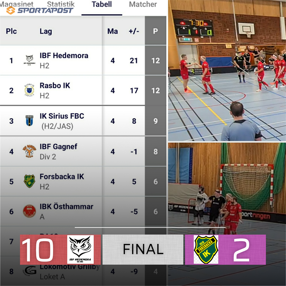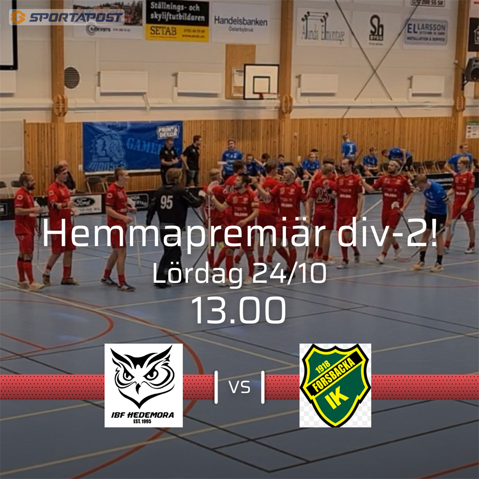 Äntligen är det dags för hemmamatch för div-2 herrarna. Efter 3 raka bortamatcher i inledningen väntar nu en spännande hemmapremiär mot Forsbacka IK. Ett Forsbacka som inlett säsongen väldigt bra med 2 raka utklassningssegrar, först 14-6 hemma mot Södra Tolvfors i premiären och sedan 14-7 mot på papperet starka Lokomotiv Grillby! I den senaste matchen fick man dock ge sig borta mot Östhammar med 6-4. Förra säsongen vann båda lagen sina hemmamatcher. Först vann Forsbacka hemma med 10-8 och i returen i Vasahallen vann Hedemora med 8-4. Tabelltoppen just nu: 1 Rasbo IK 4 matcher 12 p +17 2 IBF Hedemora 3 matcher 9 p +13 3 IK Sirius FBC 4 matcher 9 p +8 4 IBF Gagnef 4 matcher 8 p +6 5 Forsbacka IK 3 matcher 6 p +6 6 IBK Östhammar 4 matcher 6 p +6 I Gästrikelaget får vi främst se upp med: #77 Leo Jonsson, centern som på 3 matcher gjort hela 10 mål och 1 assist och är också ledare av totala poängligan. Han har tidigare gjort 4 säsonger i Allsvenskan och 6 säsonger i division 1. #14 Pelle Wallin, en skottglad forward som sällan vilar på hanen från sin högerkant. Han har på 2 matcher redan gjort 3 mål och 4 assist. #1 Gustaf Pettersson, stabil målvakt som har ett mycket vasst utkast. I IBF Hedemora ser #13 Jonathan Harald het ut. Det blir även intressant att se vad båda våra nyförvärv #11 Edvin Esselin och #96 Lukas Borg kan åstadkomma i sina premiärer inför hemmapubliken! I skrivande stund finns endast ett fåtal biljetter kvar att köpa. Biljetterna kostar 60 kr/st och går att köpa via länken nedan: https://magnetevent.se/Event/ibf-hedemora---forsbacka-ik-39524/?fbclid=IwAR3gFwKlaRI3-mI70lJLYZZzFaledD2A53hk54M3prxGhbxDik15x1EQWik Må det bästa laget vinna!