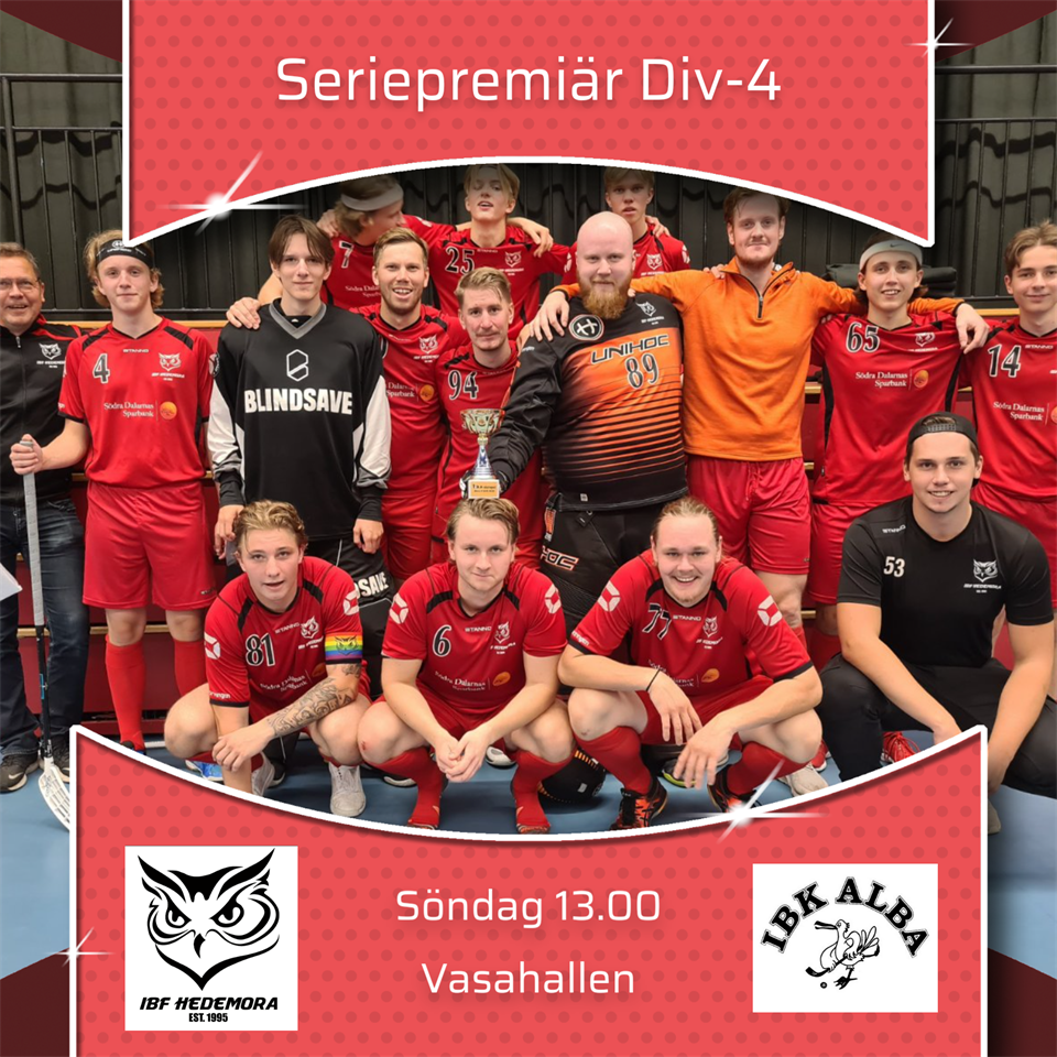 Så var det äntligen dags även för herrarnas utvecklingslag i division 4 D/G att riva igång säsongen! Det är inte heller vilken match som helst som väntar. Laget ställs mot det som på förhand känns som seriens kanske bästa motstånd, nämligen förra årets segertåg och nykomlingar IBK Alba från Sandviken. Under förra säsongen gick laget segrande ur 17 av 17 matcher med en fin målskillnad på 287-67 (220) där herrarna Olle Wahlén (83p), Anders Nygren (77p) samt Andreas Cöster (68p) höll taktpinnen i lagets interna poängliga. Med en trupp full av rutin från spel i både Allsvenskan, division 1- och 2 så väntar en oerhört tuff utmaning för Hedemoras del och lär visa sig från sin bästa sida om man ska ta poäng i denna match. När det kommer till herrarnas försäsong så har man bortsett från cupen i Mora som spelades under tidigare september hunnit spela två träningsmatcher mot IBF Lokomotiv Avestas andralag där Hedemora komfortabelt gick segrande ur båda matcherna. Herrarna ställer upp med följande lag: Målvakter: #1 Viktor Rutberg #89 Elias Nilsson Utespelare: #6 Jonatan Jacobsen #11 Edvin Esselin #14 Julius Fahlström #17 Anton Johansson #19 Tim Nissinen Eriksson #22 Tim Emilsson #25 Oliver Hjort #31 Patrik Dahlman #34 Erik Persson #40 Calle Nyberg #65 Casper Fahlström #77 Dennis Örnlind #81 Carl Englund #85 Joel Jonsson-Evaldsson #94 Daniel Lindroos Som man ser i truppen har laget förstärkts av flertalet juniorer som tagit klivet upp till seniornivå och gör nu sin första seriematch för herrarna. Matchen kommer som sagt att kunna ses av 50 st i publiken och biljetter hittar man via: Biljetter Matchen startar 13:00 imorgon söndag hemma i Vasahallen. Vi ses där!