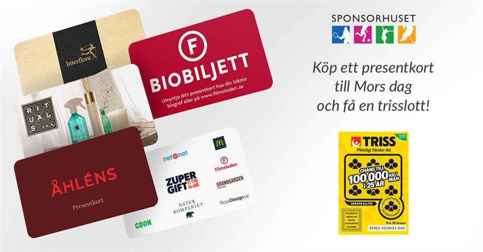 IBF Ludvika kan erbjuda dig en deal som kommer göra både dig och din mamma glad. Fram till söndag får du en Trisslott helt utan kostnad genom att köpa presentkort till mamma (eller någon annan). I Sponsorhuset Shop finner du mängder av presentkort från olika varumärken. Se hela utbudet här och glöm inte att logga in innan du klickar dig vidare: https://www.sponsorhuset.se/ibfludvika/butik//sponsorhuset-shop