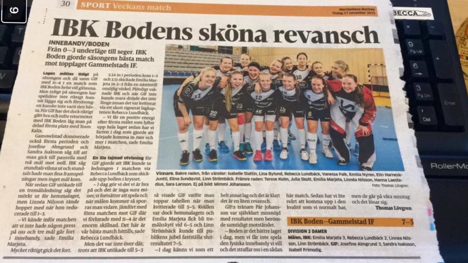 Från 0-3 underläge till seger! IBK Boden gjorde säsongens bästa match mot topplaget Gammelstad. Matchrestultat: IBK Boden-Gammelstad 7-5 Målgörare: Linnea Nilsson 1 Emilia Marjeta 3 Rebecka Lundbäck 2 Linn Strömbäck 1