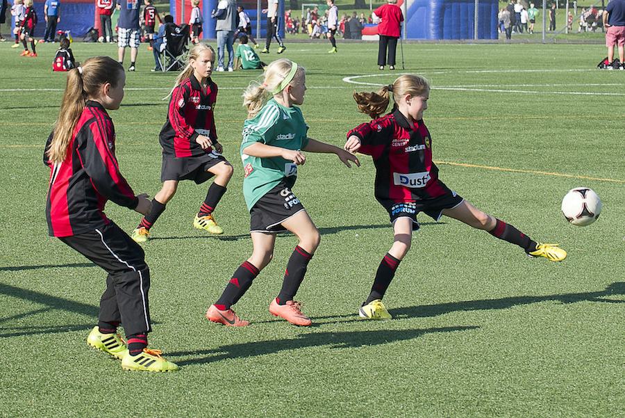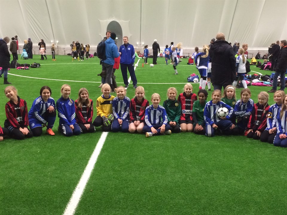 När jag kommer till Grimsta IP så är det mörkt och kallt utomhus, men inuti det uppvärmda Grimstatältet som ligger alldeles intill så är det full aktivitet. Sedan höstas så har det spelats fotbollscuper i Grimstatältet varje helg, allt från flickor och pojkar födda 03 till lite yngre barn, födda 08, har spelat inuti det stora, lite UFO-liknande tältet, med konstgräs och belysning. ”Viktigaste inte att vinna” Matcher har idag spelats här sedan 08.30 på morgonen, och intensiteten är fortfarande lika hög. Idag spelar flickor födda 06 och 07, och jag träffar på Cornelia och Nike, två tjejer i Älvsjö som hejar på sina lagkamrater från sidlinjen. – Det roligaste är såklart att spela fotboll, men det är också roligt att få träffa våra vänner, säger Nike. – Vi är alla bra kompisar i laget och brukar även umgås på fritiden, vi stöttar alltid varandra, och jag tycker att det är bra stämning i laget, säger Cornelia. De får medhåll av mamma Åsa, som varit här sedan tjejernas första match på morgonen. – Sammanhållningen i laget är jättebra och de peppar alltid varandra, oavsett match eller resultat. På planen bredvid så gör Vallentunas tjejer vågen mot publiken. De har nyss avslutat sin sista match, och nu väntar diplom och välförtjänad vila. – Det gick bra idag, det är alltid roligt att vinna så det var härligt. Det är dock inte det viktigaste, säger Ebba som spelar i Vallentuna, med ett diplom i handen. Vad är det viktigaste? – Att har roligt såklart, och det hade vi! ”Man får gåshud” Plötsligt fyller ett jubel hallen. BP 06-6 tar ledningen i sin match och euforin hos tjejerna är kolossal. Motståndatränarna gör sitt bästa för att peppa sitt lag samtidigt som spelarna i BP omfamnar varandra och tjoar. – Bra tjejer! – Heja BP! Föräldrarna vid sidlinjen gör sitt bästa för att stötta sitt lag, och får återigen jubla när BP rullar in 2-0. De rödsvarta har börjat hitta flytet i spelet och bollen går nu stundtals som ett snöre mellan spelarna. När matchen sedan blåses av står BP som segrare. Tjejerna kramar om varandra, föräldrarna hurrar och applåderar. – Man får gåshud alltså. Tjejerna är så duktiga och stöttar varandra hela tiden. Det är härligt att se, säger Christin, tränare för BP 06-6. Efter matchen så får tjejerna ta en välbehövlig paus, men det tätt packade spelschemat innebär att matcher alltid spelas. Nu äntrar Erikslunds tjejer födda 2007 planen, och jag ställer mig vid Karina och Lotta, två fotbollsmammor som följt laget sedan tidigt på morgonen. – Det är kul att se att tjejerna har så roligt, det tycker jag är viktigt, säger Karina. – Vi har ju följt tjejerna sedan de började spela fotboll som sexåringar, och det är fantastiskt att se den resa de gjort. Att se tjejerna utvecklas är otroligt häftigt, säger Lotta. Ett sus går genom publiken, Erikslund skjuter i stolpen. – Det är makalöst att se hur målmedvetna och seriösa tjejerna är, säger Karina. På planen råder jämt spel mellan lagen, och bortsett från skottet Erikslund hade i stolpen så har målchanserna lyst med sin frånvaro. – Jaaa! Efter en period med böljande spel så tar Erikslund ledningen efter en tilltrasslad situation. På sidlinjen så jublar de föräldrar som tagit sig hit för att följa sina barn. Slutsignalen ljuder, och tjejerna ger varandra i laget high-fives och kramar. Publiken bjuds även på en vinstsång vid avtackningen. ”Jättebra upplagt” Efter matchen så är Karina nöjd. – De spelade bra och hade samtidigt roligt, så det var härligt att se. Vad tycker du om cupen? – Cupen är jättebra upplagd, det har varit en fantastisk dag helt enkelt. Det är något jag verkligen skulle vilja se att tjejerna gör igen.