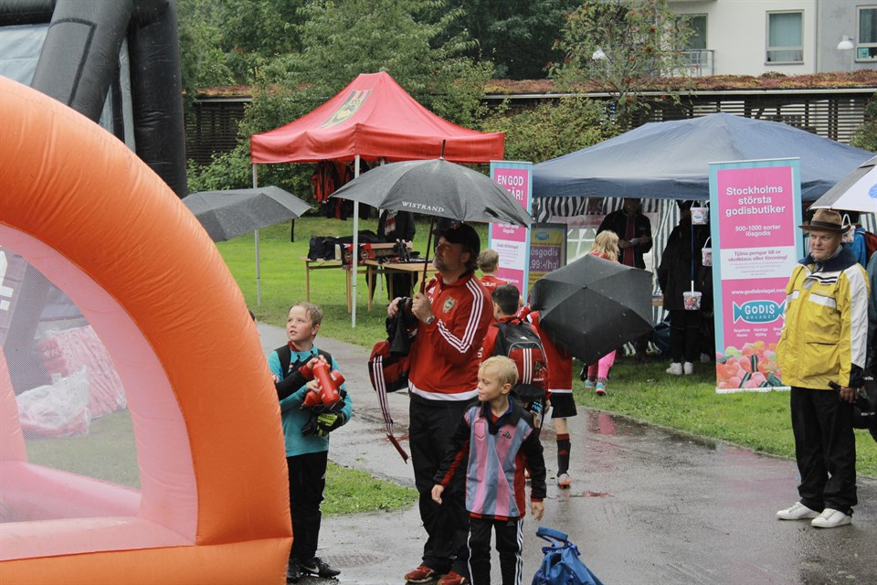 Det blev kanske inte den där soliga brittsommardagen som vi alla hade hoppats på. Regnet fullkomligt öste ner – hela söndagen – vilket fick till följd att flera av sponsoraktiviteterna gick i stöpet. Men den traditionsenliga BP-dagen blev ändå en succéartad manifestation för föreningens kraft. Spelare, ledare, föräldrar, funktionärer och sponsorer trotsade vädergudarnas vrede och begav sig ut för en heldag på Grimstafältet där över 100 intermatcher skulle spelas. Väderförhållandena gjorde planerna svårspelade, men vad gjorde det när humöret var på topp bland deltagarna? Två hoppborgar, en hinderbana och diverse andra arrangemang blev tyvärr inte av. Flera sponsortält fanns dock på plats vid vilka det fanns möjlighet att ta del av specialerbjudanden, tävlingar och prickskjutning. På scenen hölls dessutom intervjuer med A-lagsspelare från både dam- och herrlagen. Strax efter att domaren blåst av den allra sista matchen för dagen tittade solen retsamt fram, innan den fortsatte ned bakom Grimstafältets evigt gröna gräs. ________________________________ WEBB-TV OCH BILDER På BPTV finns ett längre reportage om dagens bravader. Klicka här för att se klippet. Från och med tisdag kväll kommer det även finnas fotoalbum uppladdat på hemsidan. Forza BP!