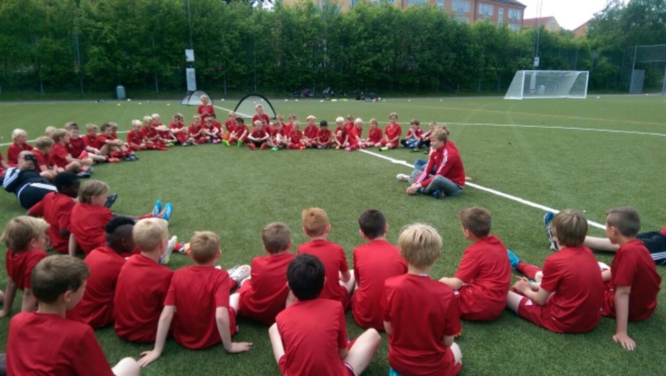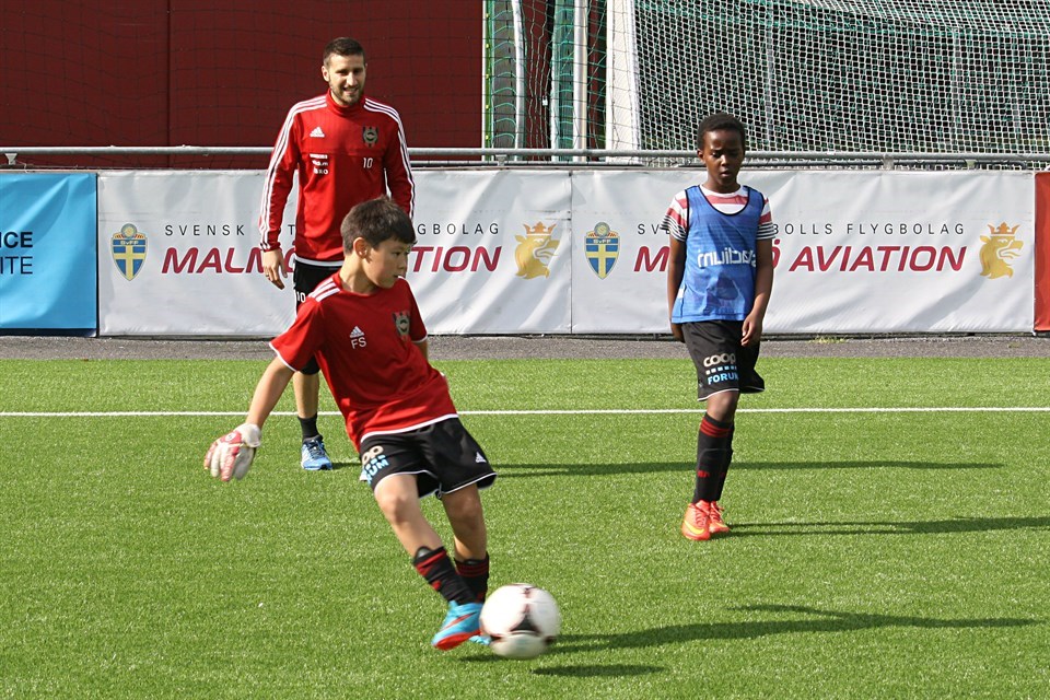 I våras sjösatte föreningen en satsning för att öka ungdomslagens aktivitet på sociala medier. Ett led i satsningen var en tävling där fina priser stod på spel, bland annat en träningsdag med föreningens herrlag. P05-9 stod som lyckliga vinnare efter en spännande lottning, och den gångna söndagen var det äntligen dags. Tio förväntansfulla tioåringar samlades tidigt under söndagen för att delta i det efterlängtade träningspasset. Efter en kort pratstund med Magni Fannberg fick de möjlighet att ta en rundtur i a-lagets lokaler. I gymmet träffade de förre landslagsmannen Fredrik Stoor, och i omklädningsrummet kunde de tillsammans med Davor Blazevic, Gustav Sandberg-Magnusson och en drös andra BP-spelare ladda upp inför dagens träningspass. Efter en stunds uppvärmning i den strålande solen var det dags – under ledning av Gabriel Özkan och Gabriel Petrovic drillades killarna i ett antal passningsövningar på Grimstas a-plan. Övningarna övergick sedan i matchspel, där Özkan och Petrovic deltog i varsitt lag. Förmiddagspasset avslutades med straffläggning på a-lagets målvakt Rasmus Emanuelsson, som de unga BP-lirarna lyckades överlista vid ett antal tillfällen. Lunchen intogs i klubbhuset, där spelarna samtidigt fick lyssna på en föreläsning om skadeförebyggande träning med BP:s naprapat Peyman Adabi. Många konkreta tips delades ut. Bland annat uppmanades spelarna att balansera på ett ben när de borstar tänderna – fotlederna stärks och stukningar förebyggs. Efter pausen var det dags för dagens tuffaste utmaning; träning med Magni Fannberg. Möjligheten att imponera på BP:s huvudtränare är få förunnat, och spelarna visade högklassig koncentration och förmåga träningspasset igenom. Spelarna fick vässa sitt passningsspel och sina dribblingar i 40 intensiva minuter innan Magni avslutade passet med en skottävling. – Magni var en grym tränare. Tuff, men det är så det ska vara, säger Sam Linder i P05-9. Sebastian Saliba såg matchen med Özkan och Petrovic som dagens höjdpunkt. – Det var en riktigt kul match. Jag var i lag med Gabriel Petrovic, men tyvärr så förlorade vi matchen. Efter träningspassen på Grimsta väntade ytterligare fotboll för grabbarna; en träningsmatch mot Ängby återstod innan fotbollsveckan för P05-9 kunde avslutas. Kolla in lagsidan för BP P05-9. Se fler bilder från träningarna här.