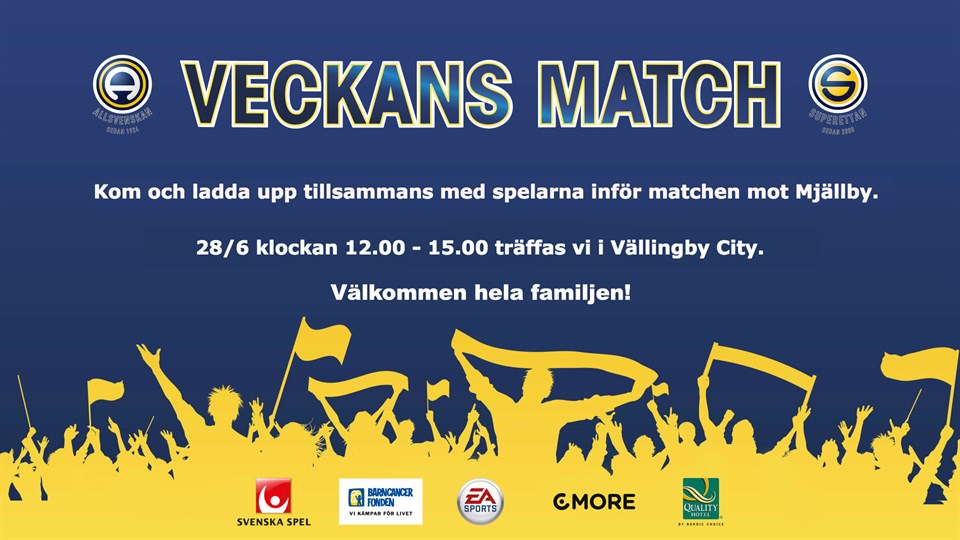 Veckans Match är en nationell turné som besöker samtliga klubbar i Allsvenskan och Superettan. Under två dagar besöker turnén aktuellt lag och stad för att tillsammans med A-lagsspelare och inbjudna gäster umgås och utföra uppdrag och aktiviteter tillsammans med sina fans – dig. Initiativet, som är taget av SEF (Svensk Elitfotboll), har till uppgift att ge Sveriges elitklubbar möjligheten att möta sin publik på ett inspirerande, engagerande och underhållande sätt – utanför fotbollsplanen – som stärker banden mellan klubbarna och allmänheten. Vi ses i Vällingby City den 28/6 klockan 12:00 – 15:00!