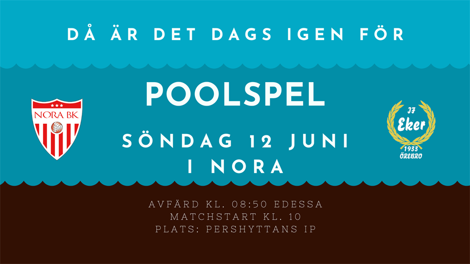 Hej på er, Nu på söndag 12:e juni är det dags för årets andra poolspel i klassen Pojkar 8 år. Meddela/kommentera vilka som vill spela. Klara spelare: Ahmad, Love, Melvin, Millian, Mio,.. Schema: 08:50 Avfärd Restaurang Edessa för samåkning. 10:00 IF Eker - Nora BK 11:00 IFK Hallsberg FK - IF Eker Vi är hemma igen ca 12:30 Poolspelet spelas vid Pershyttans IP, utanför Nora. Kul med matcher igen. Heja Eker!